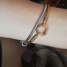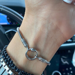 Серебряный браслет прочного плетения с родиевым покрытием, которое помогает сохранить его первоначальный вид и защитить от агрессивного воздействия внешней среды. Его концы имеют особую форму купола с нанесенными на них словами-обращениями к Богу. На кольцо, которое служит замком браслета, нанесен узор. Это византийский орнамент-символ чистоты и верности.