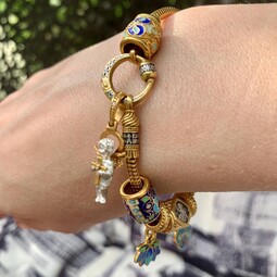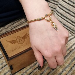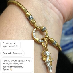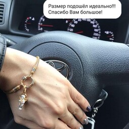 В комплекте идет позолоченный браслет-основа прочного плетения. Его концы имеют особую форму купола с нанесенными на них словами-обращениями к Богу. На кольцо, которое одновременно служит замком браслета и переходником для подвески, нанесен узор. Это византийский орнамент-символ чистоты и верности.