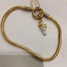 Подвеска в виде Ангела-Хранителя выполнена из серебра с позолоченными элементами. Ангел появляется рядом с каждым человеком после Крещения. Он охраняет, наставляет и направляет. Защищает душу человека от злых духов и тяжких грехов.