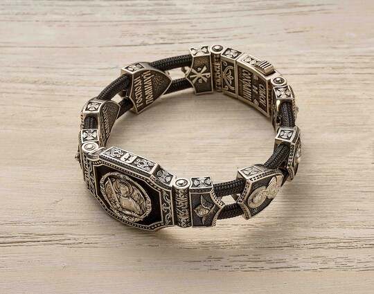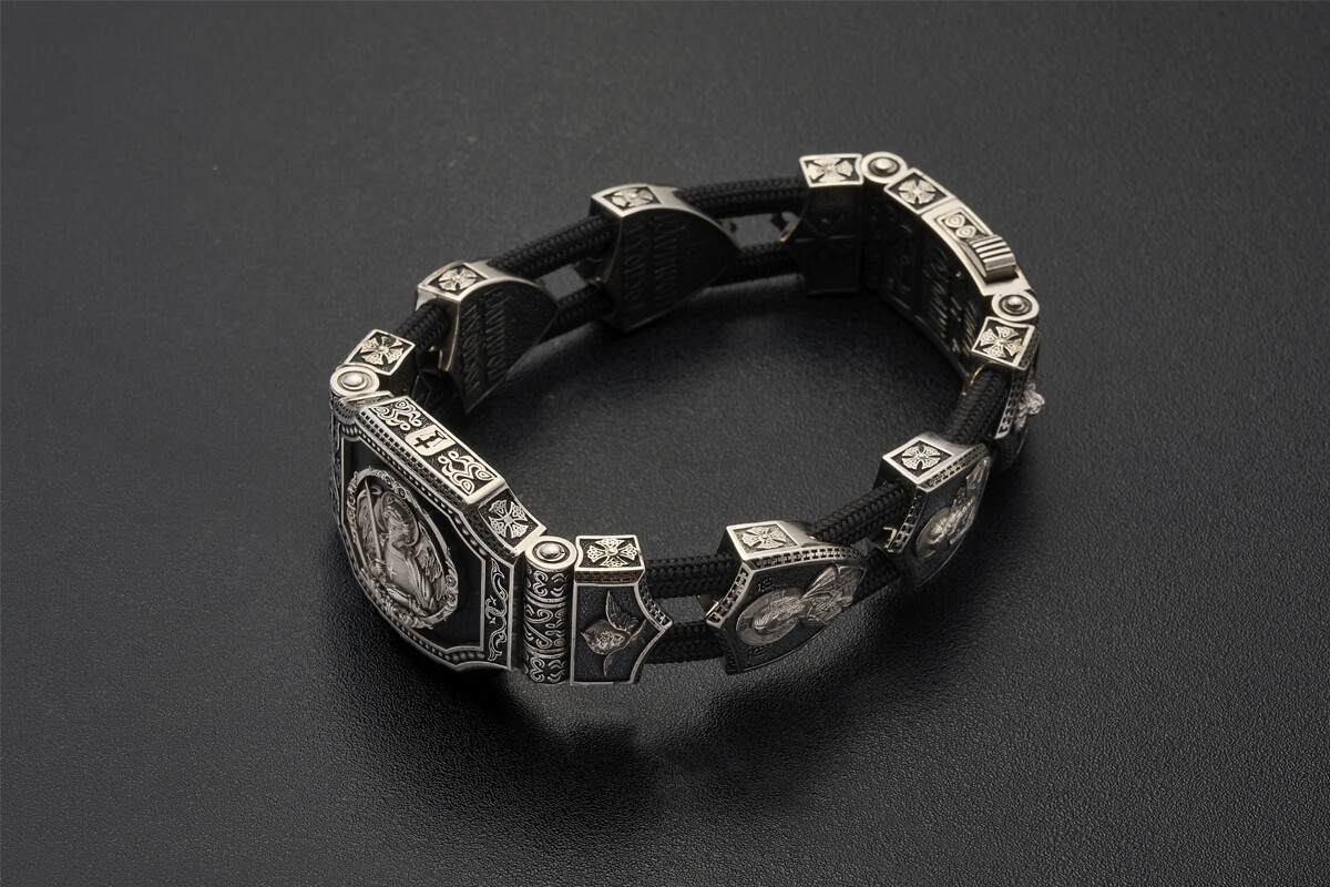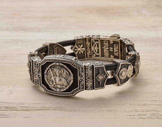 На центральной части браслета изображен Архангел Михаил. На обороте выгравирована молитва. Звенья соединены между собой очень крепким нейлоновым шнуром. На обороте каждого звена находятся слова молитвы "Господи Помилуй" и изображения Хризмы.