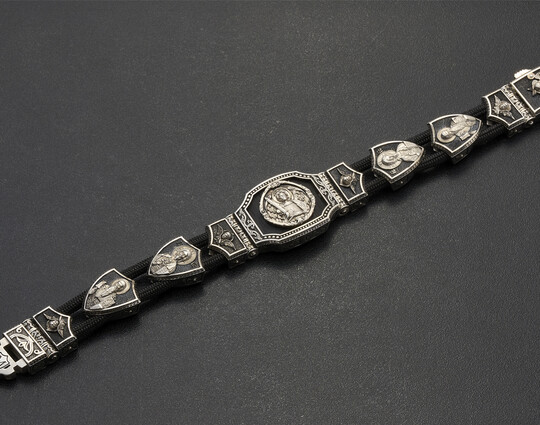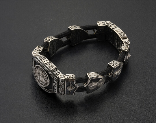 Серебряный браслет выполнен на основе эбена. Сочетание дерева и серебра имеет символическое значение, особую значимость. Деревянная часть воспринимается как напоминание о Животворящем Кресте. Это как источник боли и страданий для Христа, так и спасение для любого верующего.