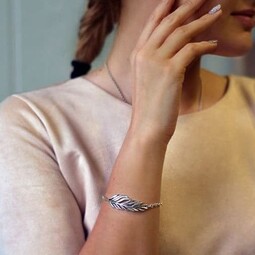 Изящный серебряный браслет из цепочки плетения «якорь», которая соединяет пальмовую ветвь и овальный медальон. Пальмовая ветвь имеет символичное значение и у верующих ассоциируется с Христом и его страданиями. На медальоне на лицевой и внутренней стороне нанесены слова, благословляющие Бога.