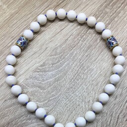 Православные чётки выполненные из мамонтова бивня. Цвет бусин прекрасно сочетается с цветными эмалевыми бусинами-разделителями, а также с эмалевым Голгофским крестом. Такие чётки носят название «33 бусины». 31 из них выполнена из мамонтова бивня, 3 - из серебра с эмалью.