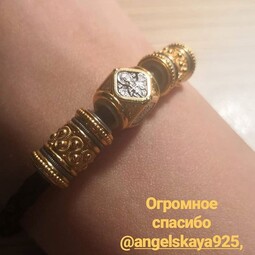 Кожаный браслет с бусинами из серебра с позолоченной отделкой. На центральной бусине изображен Ангел Хранитель. Он появляется рядом с каждым человеком во время Крещения и сопровождает его всю жизнь. Ангел защищает нас в минуты опасности и искушений, помогает встать на путь истинный.  По своей воле Ангел Хранитель не может вмешиваться в наши дела, его нужно просить о помощи в ежедневной вечерней молитве, поэтому одна из молитв написана на обратной грани бусины. Две другие бусины украшены орнаментом в древнерусском стиле.