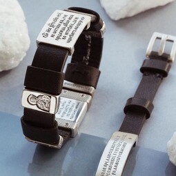 Стильный мужской браслет с лаконичным дизайном. На прочном кожаном ремешке расположены серебряные вставки с молитвами и образами Святых. Это иконы Александра Невского и Николая Чудотворца, которым можно молиться при любой опасности или просто в сложной жизненной ситуации.