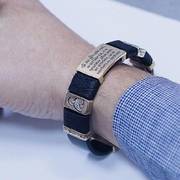 Слова-обращения  к Богу, которые написаны на вставках можно читать по надобности. Браслет для мужчины выполнен из натуральной кожи с серебром 925 пробы.