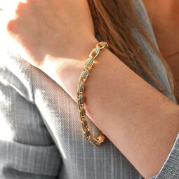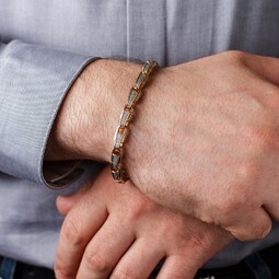 Серебряный браслет с позолоченной отделкой. Он состоит из литых звеньев, которые украшены изящным византийским орнаментом с вплетенным в него крестом под названием «Трилистниковый». Эта форма креста чаще всего используется у православных христиан, особенно в России.