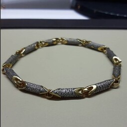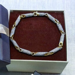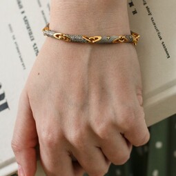 Серебряный браслет с позолоченной отделкой. На первые три звена от замочка нанесен орнамент и небольшой позолоченный крестик в центр. На остальных написаны Божественные слова – часть текста из 22 Псалма Давида, состоящего из размышлений о милости Господней, которая посылается нам, когда необходимо, и об испытаниях человека.