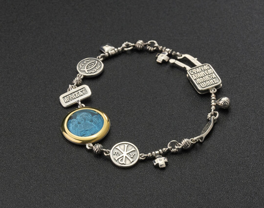 Браслет из серебра 925 пробы с православными символами. В центре - образ Архангела Михаила, вырезанный в голубом кварце. Подвески на браслете украшены 12 бриллиантами диаметром 1 мм. Образ Архангела Михаила окружен позолотой, что подчеркивает духовную значимость этого элемента.