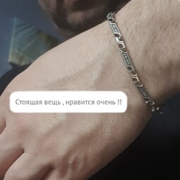 Серебряный браслет с родиевым покрытием, состоящий из звеньев геометрической формы. На них нанесен изящный византийский орнамент.  Сам корпус звена затемнен.