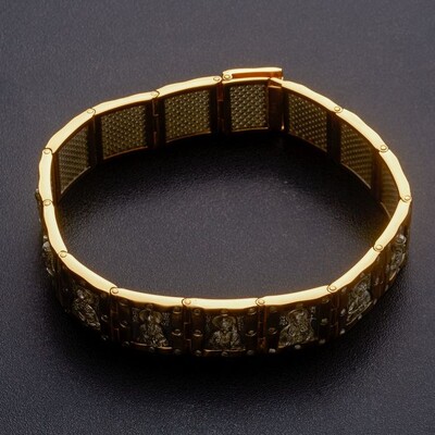 Массивный серебряный браслет позолоченной отделкой.  На центральном звене браслета написан текст 22 Псалма. Верующие читают его в любой ситуации. Он помогает справиться человеку с трудностями, жизненными неурядицами и проблемами. На остальных звеньях изображена Хризма- древнейший символ Христа. Она составлена из греческих букв, с которых начинается его имя.