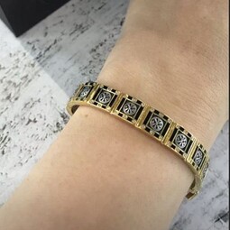 Массивный серебряный браслет позолоченной отделкой, эмалевой росписью и фианитами, вставленными по контуру браслета.  На центральном звене браслета нарисован орел. В православной вере эта птица символизирует нашу душу, которая словно летит к Солнцу и крепнет благодаря духовной работе, молитвам и добрым делам. На остальных звеньях изображена Хризма- древнейший символ Христа. Она составлена из греческих букв, с которых начинается его имя.