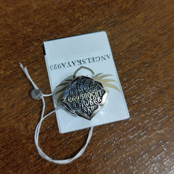 В лепестки незабудки вписаны четыре ангелочка вокруг маленького крестика по центру. На обороте бусины - слова, которые напоминают о Боге обладателю изделия.