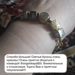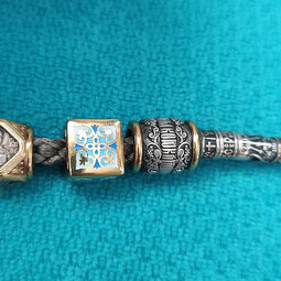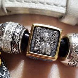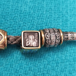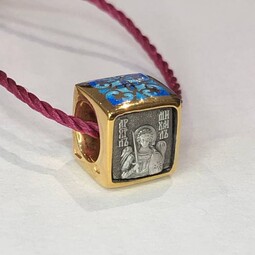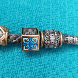 Квадратная бусина из серебра с позолотой и эмалевой росписью. На одной из сторон – изображение Архангела Михаила с крестом и мечом в руках, который защищает душу человека от злых духов и тяжких грехов.