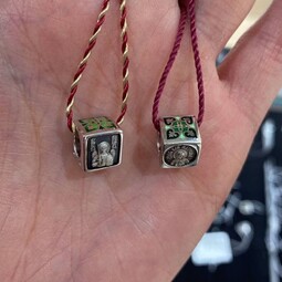 Квадратная бусина из серебра с родиевым покрытием и эмалевой росписью. На одной из сторон – изображение Архангела Михаила с крестом и мечом в руках, который защищает душу человека от злых духов и тяжких грехов.