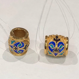 Позолоченная бусина из серебра, украшенная эмалевой росписью, которая напоминает своим орнаментом облачения царя: тяжелая парчовая или шелковая вышитая ткань. Вышивка чаще всего делалась золотой или серебряной нитью.