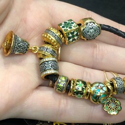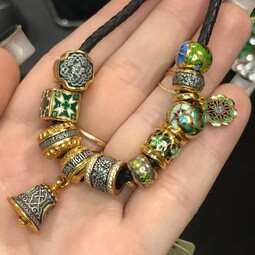 Серебряная бусина с позолотой и эмалевой росписью в виде растительного орнамента - плюща. Это растение - символ вечности, верности и неумирающей любви. Таким его признали из-за его вечнозеленых листьев, которые растут вверх, цепляясь за опору.