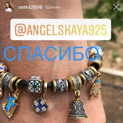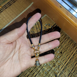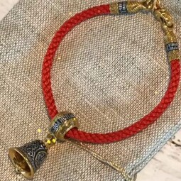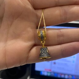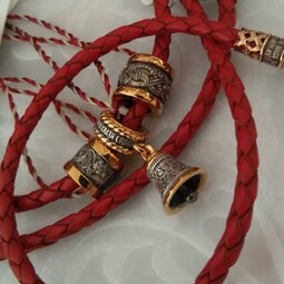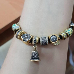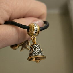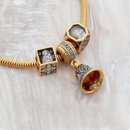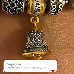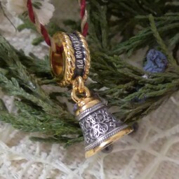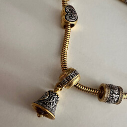 Серебряная бусина, на которой написаны слова-обращения к Богу, украшенная позолоченной отделкой и подвесом в виде небольшого колокольчика. На колокольчик нанесен резной орнамент.