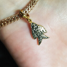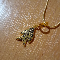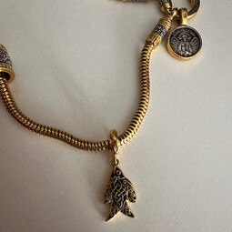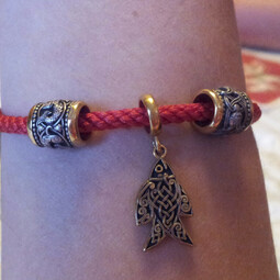 Серебряная бусина в виде рыбы, которая является древнейшим символическим обозначением Христа. Так Его изображали первые христиане. Кроме того, с рыбами связывают учеников Иисуса и просветителей, которые были рыбаками и «вылавливали» человеческие души из морских пучин.