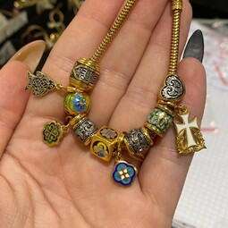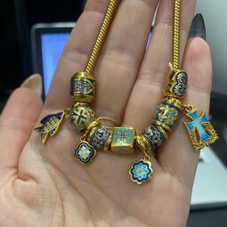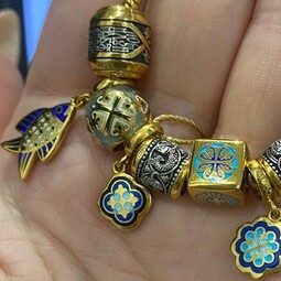 Набор бусин включает в себя: бусина «Вьюнок», подвес «Рыбка», бусина. Эмаль, подвес «Трилистник». Эмаль, бусина «Рыбки», бусина «Ангел-Хранитель», подвес «Греческий крест». Эмаль, бусина «Птички», бусина, Процветший крест. Подвес, бусина «Сердце.
