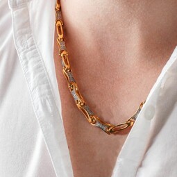 Звенья литой цепи из серебра с позолотой скреплены друг с другом с помощью шарнира. На них символически изображены кресты из цветков лилии, заключенные в круг.