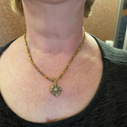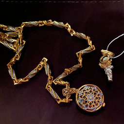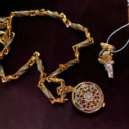 Серебряная цепь с позолоченной отделкой, состоящая из литых звеньев необычной формы. На каждом из них написаны Божественные слова: первая строка из Псалма Давида, состоящего в целом из размышлений о милости Господней, которая посылается нам, когда необходимо, и об испытаниях человека.