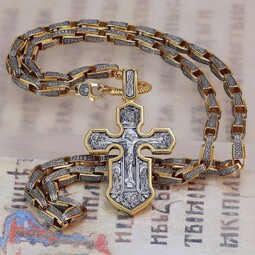 Серебряная цепь с позолоченной отделкой. Она состоит из литых звеньев, которые украшены изящным византийским орнаментом с вплетенным в него крестом под названием «Трилистниковый». Эта форма креста чаще всего используется у православных христиан, особенно в России.