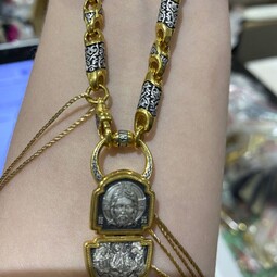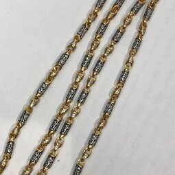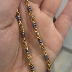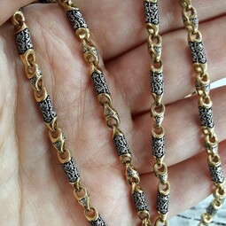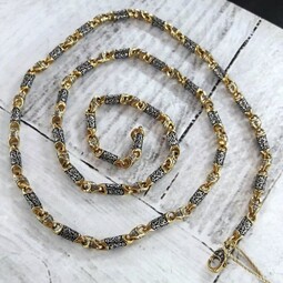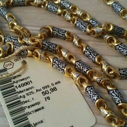 Серебряная цепь с позолотой, состоящая из литых звеньев необычной формы, на которые нанесен изящный орнамент. Сам корпус звена затемнен.