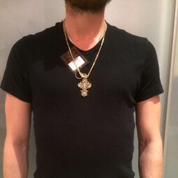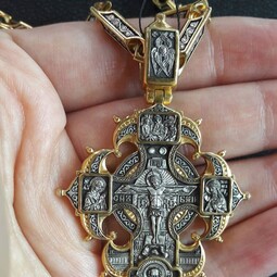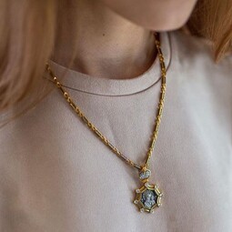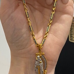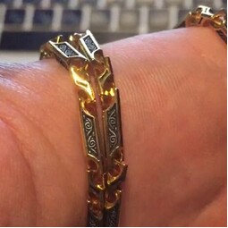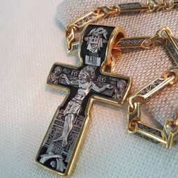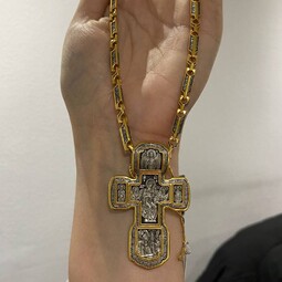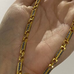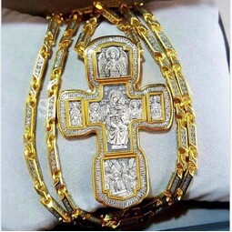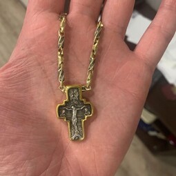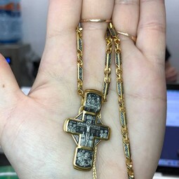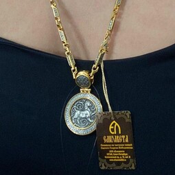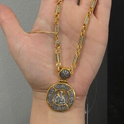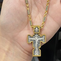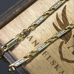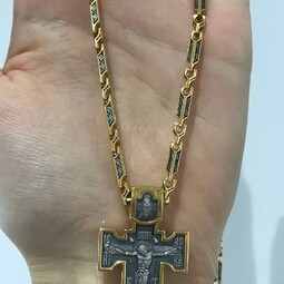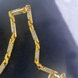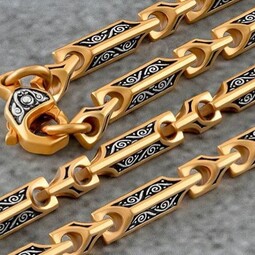 Серебряная цепь с позолотой, состоящая из литых звеньев необычной формы, на которые нанесен изящный орнамент. Сам корпус звена затемнен