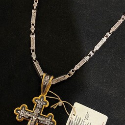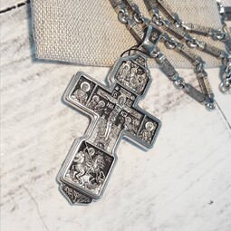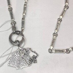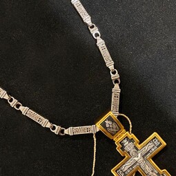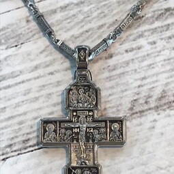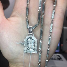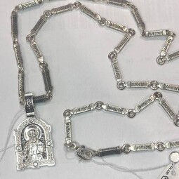 Серебряная цепь с родиевым покрытием, которое защищает изделие от почернения и агрессивного воздействия внешней среды. Цепь состоит из объемных звеньев геометрической формы. На каждом из них написана «Предначинательная молитва», которую можно читать как защитную в сложных и опасных ситуациях, так и помогающую в любых делах.