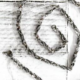 Серебряная цепь с родиевым покрытием, которое защищает изделие от почернения и агрессивного воздействия внешней среды. Цепь состоит из литых звеньев необычной формы. На каждом из них написаны Божественные слова: первая строка из Псалма Давида, состоящего в целом из размышлений о милости Господней, которая посылается нам, когда необходимо, и об испытаниях человека.