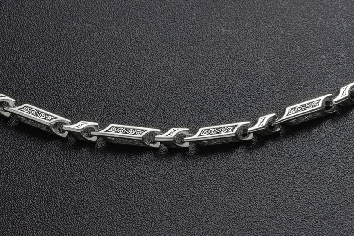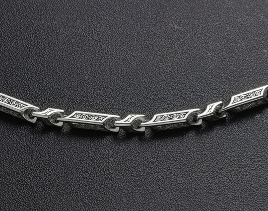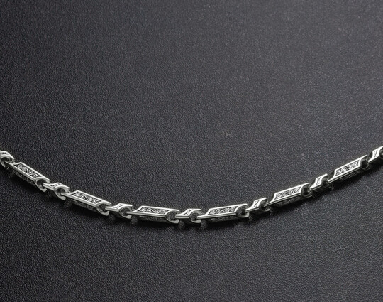 Серебряная цепь состоит из литых звеньев геометрической формы. На них, на искусственно затемненный  фон, нанесен изящный византийский орнамент.