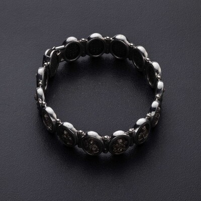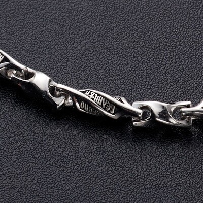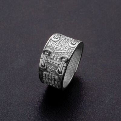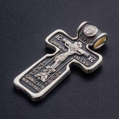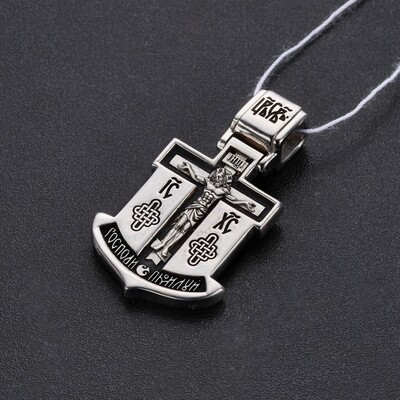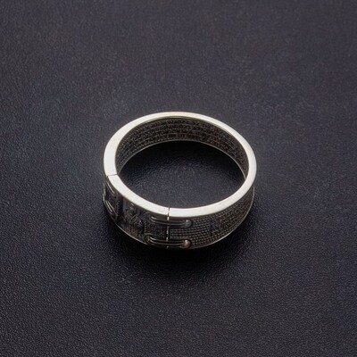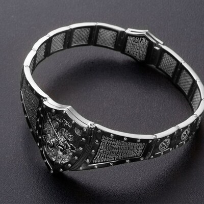 Серебряная цепь, состоящая из объемных звеньев геометрической формы. На них написан Псалом 50, который называется также покаянным. Он носит такое название, потому что в нем выражено и глубокое сожаление о сделанном, и сильнейшая молитва с просьбой о помиловании.