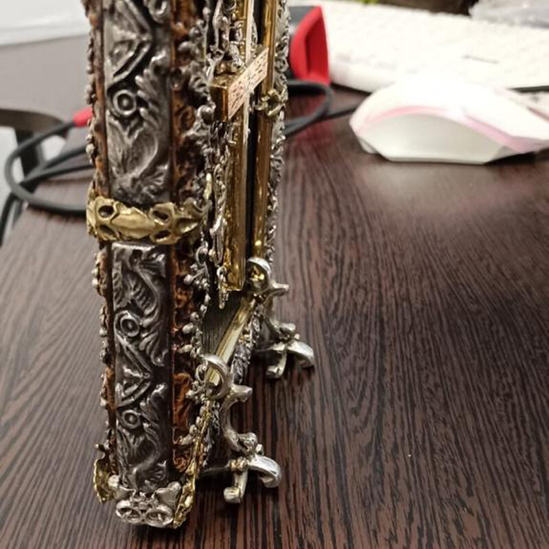 В комплекте есть серебряные ножки-подставки. Они необходимы для того, чтобы икону можно было поставить вертикально.