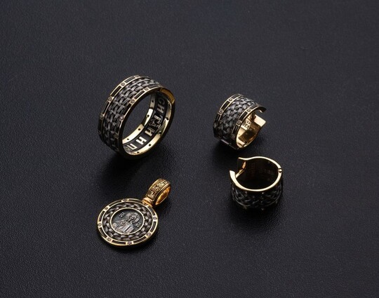 Серебряные переплетающиеся нити присутствуют на каждом украшении из набора, как и фианиты. На кольце с внутренней стороны выгравирована молитва "Спаси, Господи, и помилуй". Этой молитвой просят даровать благополучие и избавить от несчастий.