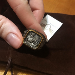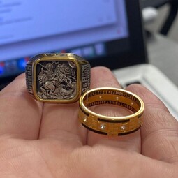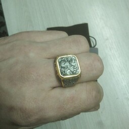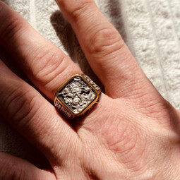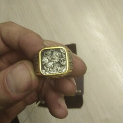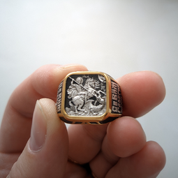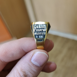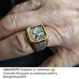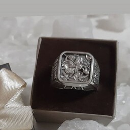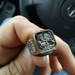 Массивное мужское кольцо в форме печатки. На нем, на затемненном фоне, изображен Георгий Победоносец.  Георгий очень почитается в Христианской Церкви, потому что он защищает воинов и помогает трудящимся.