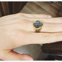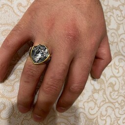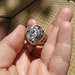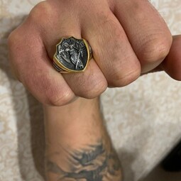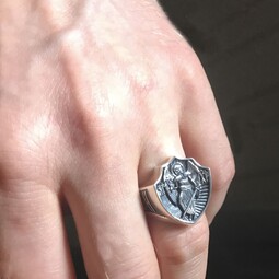 Массивное мужское кольцо в форме печатки. На нем изображен Ангел Хранитель, держащий крест и меч. Считается, что именно так Ангел охраняет человека от нападений физического и духовного плана.