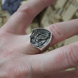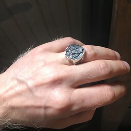 Массивное мужское кольцо в форме печатки. На нем изображен Ангел Хранитель, держащий крест и меч. Считается, что именно так Ангел охраняет человека от нападений физического и духовного плана.
