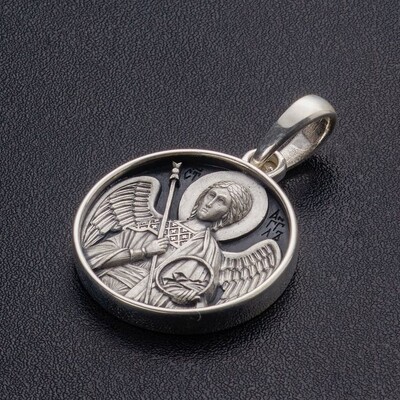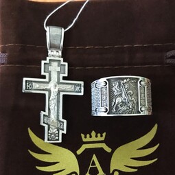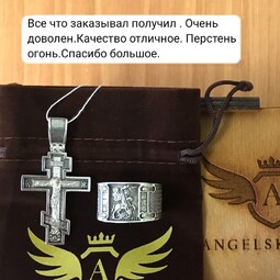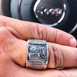 Массивное мужское кольцо на котором изображен Георгий Победоносец и написана молитва.