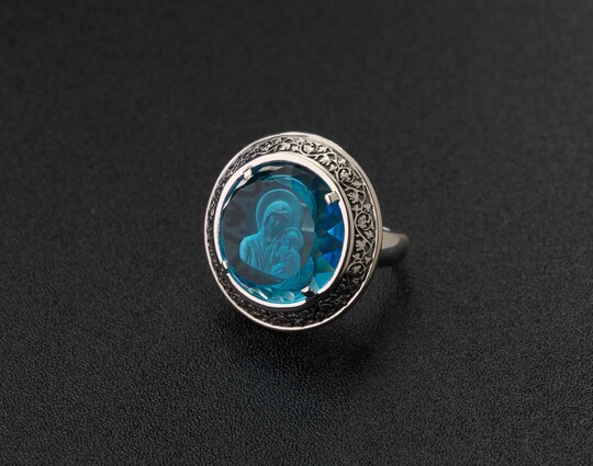 Внутри находится крупный голубой искусственный кварц, в котором по технике инталии вырезано тонко детализированное рельефное изображение Казанской иконы Божией Матери - почитаемы образ, известный своими чудесными исцелениями. Им благословляли на долгую и счастливую семейную жизнь.