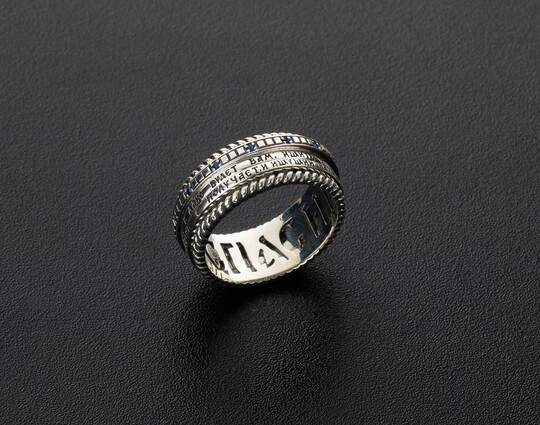 Кольцо выполнено из серебра 925 пробы. Оно снабжено подвижными элементами. Строгий и лаконичный дизайн акцентирует внимание на духовном содержании украшения. На нем начертаны слова "Просите и дано вам будет...".