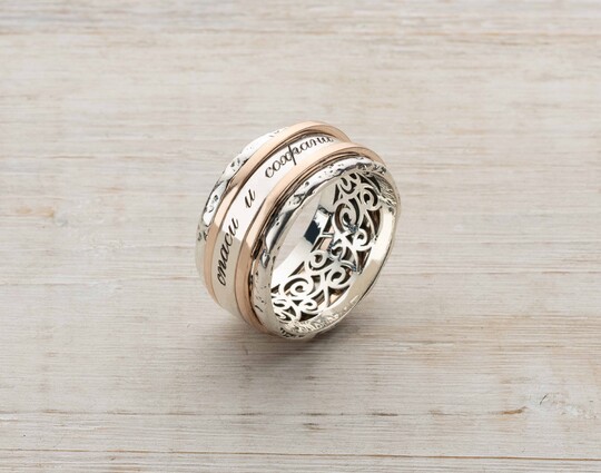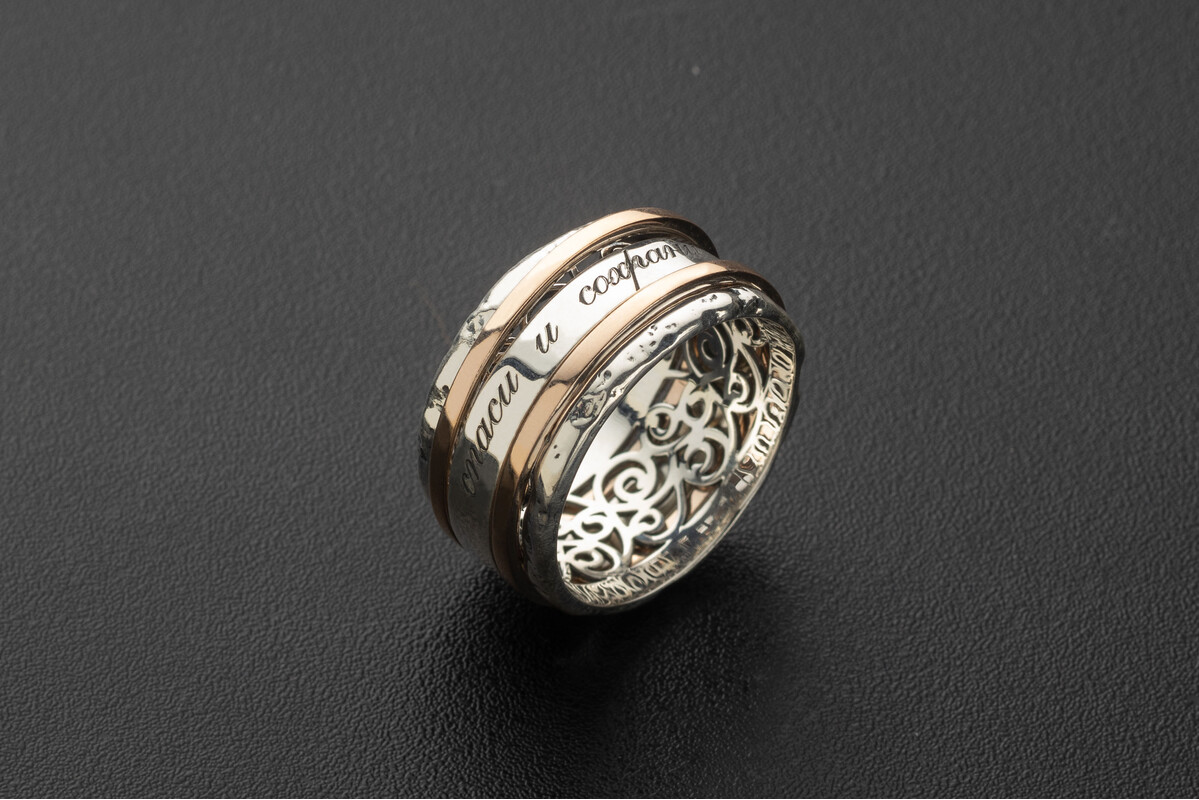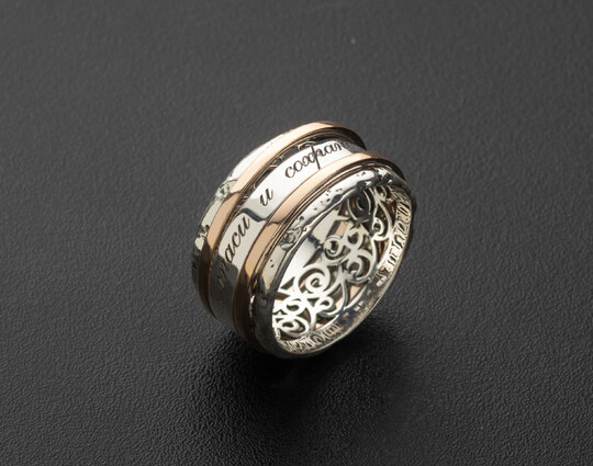 Кольцо выполнено из серебра 925 пробы. В центре кольца находится надпись "Спаси и Сохрани". Это сильная молитва, короткая, но очень важная для любого человека, который доверяет свою судьбу на милость Господа и надеется на его помощь и защиту.