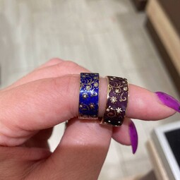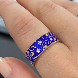 Серебряное с позолотой кольцо с ярким ультрамариновым покрытием. Также оно украшено растительным узором и небольшими фианитами. На внутренней части написаны слова, с которыми верующие обращаются к Святой Матроне Московской - О блаженная мати Матроно, исцели недуги наши лютыя /О блаженная мать Матрона, исцели недуги наши страшные. С ней связывают много случаев чудесного исцеления.