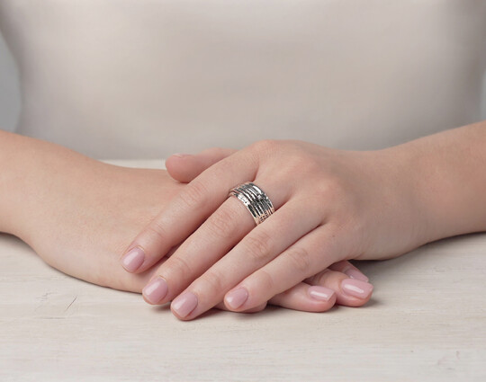 Серебряное кольцо содержит вращающиеся элементы. Их можно покручивать во время молитвы для концентрации и сосредоточения духовных сил.