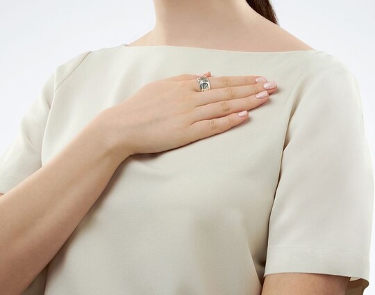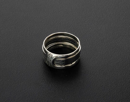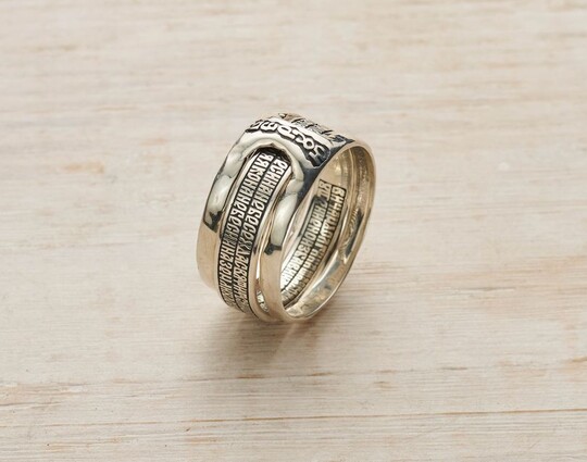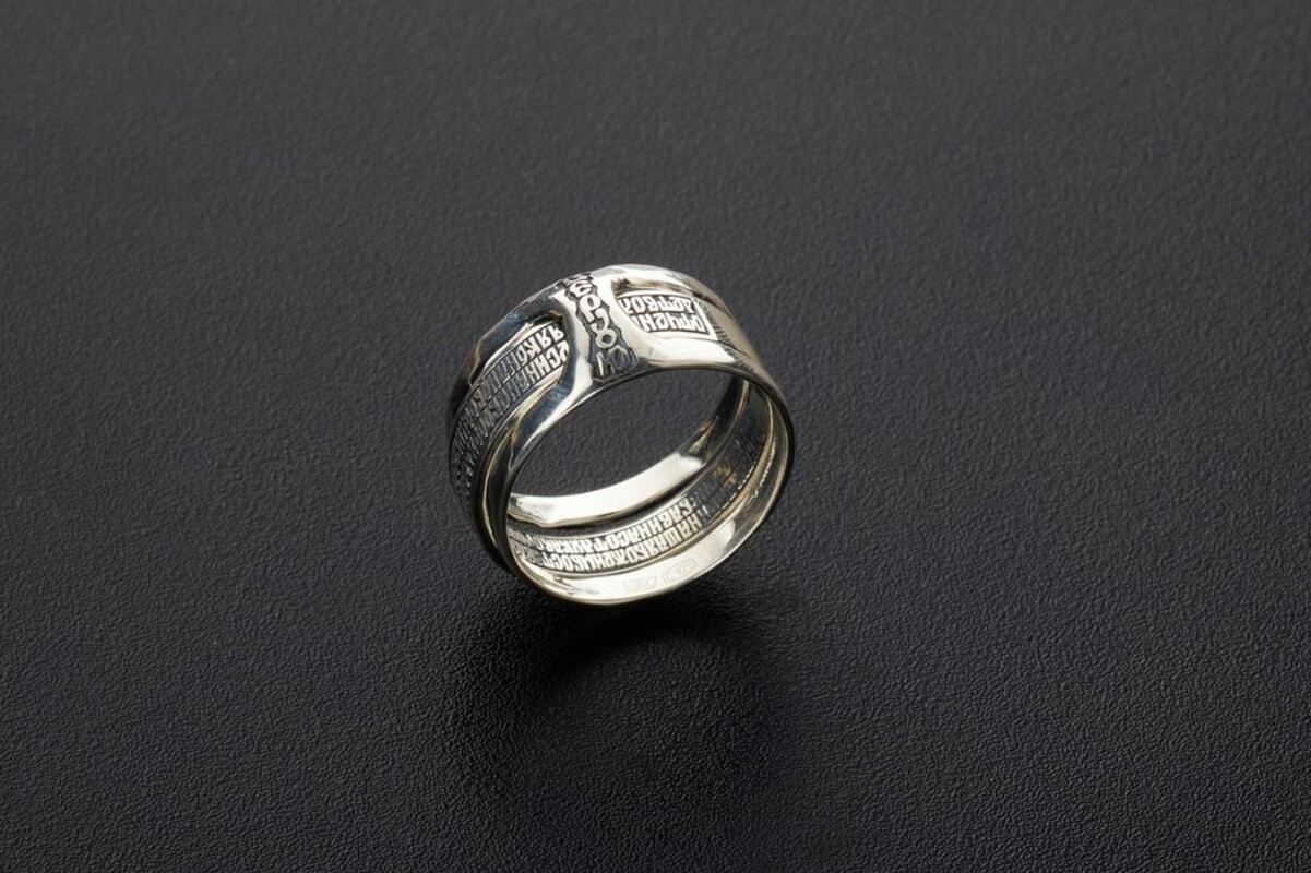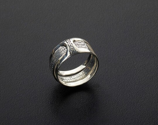 Кольцо трансформер, состоящие из двух колец, выполнено из серебра 925 пробы. На одном кольце написана молитва "Отче Наш", на другом "Верую".