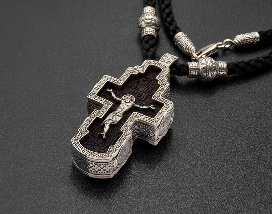 Крест дополнен текстильным гайтаном с молитвой "Спаси и сохрани" на концевиках.
