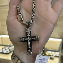 Серебряный крест выполнен на основе эбена. Сочетание дерева и серебра имеет символическое значение, особую значимость. Деревянная часть воспринимается как напоминание о Животворящем Кресте. Это как источник боли и страданий для Христа, так и спасение для любого верующего.