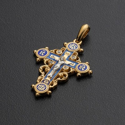 Крестик выполнен в соответствии с православными традициями в технике горячей эмали. Вместе с позолотой это создает яркий эффект. Поверхность изделия покрыта растительным орнаментом, а на ушке изображен цветок лилии - символа чистоты, благочестия и целомудрия.