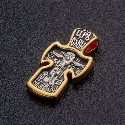 На внешней стороне изображен голгофский крест с терновым венцом, как символом страданий Спасителя, которые он перенес за все человечество. По бокам от него - предстоящие Святитель Иоанн и Богородица. В навершии размещено изображение Пресвятой Троицы.