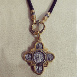 Серебряный крест с позолоченной отделкой, который выполнен в самых лучших традициях Православной Церкви. На лицевой стороне помещено изображение Иисуса Христа. Он представлен как Господь Вседержитель. В одной руке он держит книгу Бытия. Другая рука поднята в молитве. Книга Бытия часто сравнивается с Книгой Жизни, в которой записываются все действия человека.